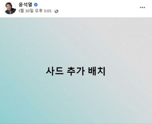 윤 후보는 지난달 30일 페이스북에 '사드 추가 배치'라는 한 줄 공약을 올렸다. 이날 북한이 동해상으로 중거리 탄도미사일을 발사한 데 대한 반응이었다. 이어 설날인 1일에는 인천시 강화군 강화제적봉평화전망대를 찾아 "사드를 포함한 중층적 미사일 방어망을 구축해 수도권과 경기 북부 지역까지 북한의 핵미사일 위협으로부터 우리 국민의 안전을 확실히 지키겠다"며 안보 행보를 이어갔다. 최근 북한 도발이 이어지는 가운데 보수 지지층 결집에 나선 것으로 보인다.