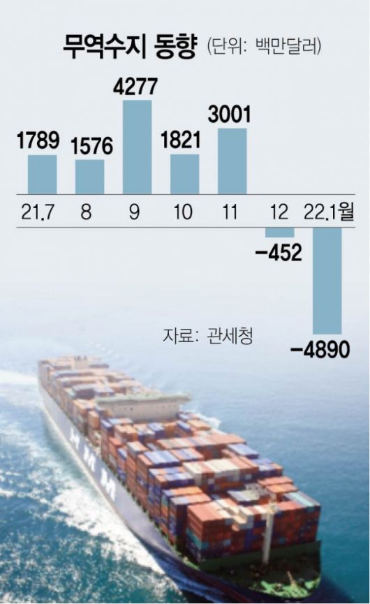 지난달 우리나라 무역수지가 48억 9000만 달러 적자를 기록했다. 지난 1966년 무역 통계 작성 이후 역대 최대 규모이며 2개월 연속 무역 적자는 2008년 글로벌 금융위기 이후 14년 만에 처음이다. 지난달 수출이 1월 기준 처음 500억 달러를 넘겼지만 대규모 무역 적자에 빛이 바랬다. 두 달 연속 무역 적자가 이어지며 올해 수출 환경이 지난해와 달리 장밋빛만은 아닐 것이라는 분석이 제기된다.