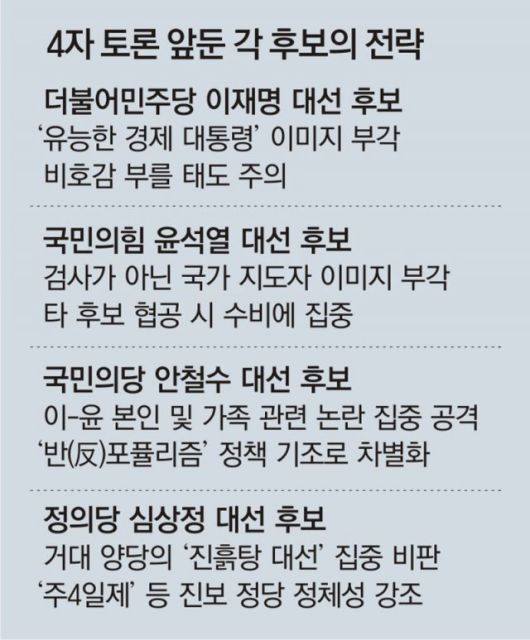 여기에 다른 세 후보의 집중 공세가 예고되는 만큼 윤 후보는 수비 전략을 세우는 데도 공들이고 있다. 국민의힘 선대본 관계자는 “토론이 끝나면 공세를 가장 많이 받은 후보가 ‘1등 후보’라는 인식이 생기게 된다”며 “‘윤석열 난타전’이 펼쳐질 경우 윤 후보가 해명할 시간을 많이 얻는다는 점에서도 결코 불리하지 않다”고 했다.