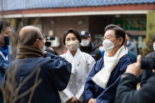 이재명 더불어민주당 대선 후보가 설 명절인 1일 오전 부인 김혜경 씨와 함께 경북 안동김씨 화수회를 방문해 시민들과 인사를 나누고 있다. 더불어민주당 선대위 제공 |