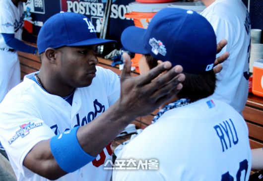 LA 다저스 시절 류현진(왼쪽)과 야시엘 푸이그. LA | 최승섭기자 thunder@sportsseoul.com |