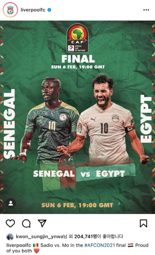 리버풀도 두 선수의 맞대결을 주목하고 있다. 결승 대진이 확정되자 리버풀은 공식 SNS에 마네와 살라의 맞대결에서 ‘둘 다 자랑스럽다’라는 코멘트와 함께 게시물을 올렸다.