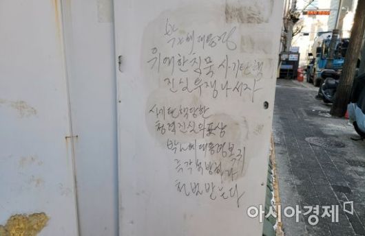 서울 중구 을지로 한 공사장 인근 철제 보호막에 박근혜 전 대통령을 지지하는 글이 쓰여있다. 사진=한승곤 기자 hsg@asiae.co.kr |
