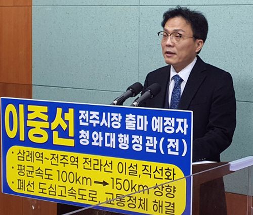 (전주=연합뉴스) 김동철 기자 = 6월 지방선거에서 전북 전주시장 출마를 선언한 이중선 전 청와대 행정관이 "삼례역에서부터 전주역에 이르는 전라선을 직선화하겠다"고 공약했다.