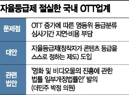 OTT업계에서는 계속 세제 지원과 자율등급제 도입 등 다양한 지원방안을 마련하겠다는 정부 약속이 지켜지지 않는데 불만을 토로해왔다. 과기정통부, 문체부, 방통위로 구성된 OTT 정책협의체도 콘트롤타워 문제를 두고 이견을 보여왔다. 업계 관계자는 "무료 플랫폼인 유튜브가 자유롭게 영상을 게재하는데 비해 국내 OTT들은 자막 1줄만 추가해도 원칙적으로는 다시 허가를 받아야 한다"고 토로했다.
