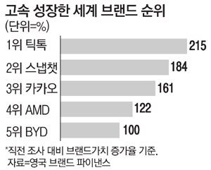 이번 조사에서 카카오 브랜드가치는 47억달러(약 5조6300억원)로 평가됐다. 성장률 1위는 전년보다 215% 성장한 틱톡(590억달러, 약 70조7000억원), 2위는 184% 성장한 스냅챗(66억달러, 약 7조9000억원)이었다. 카카오 뒤로는 미국 정보기술(IT) 기업 AMD(60억달러, 약 7조1900억원), 중국 전기차 기업 BYD(64억달러, 약 7조6700억원)가 이름을 올렸다. 이 보고서는 디지털로 무장한 Z세대(1996~2010년 출생)의 소비 영향력이 확대되면서 소셜미디어 기업 브랜드가치가 급성장하고 있다고 평가했다.