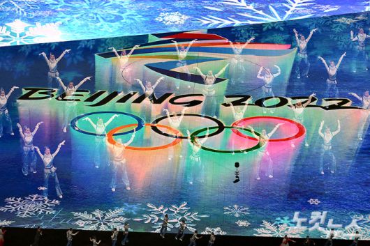 4일 중국 베이징 국립경기장에서 열린 2022 베이징동계올림픽 개막식에 오성홍기와 올림픽기가 게양돼 있다.2008년 하계 올림픽 때는 개회식이 식전 행사를 포함해 4시간이 넘고, 출연 인원도 1만5천 명에 달하는 '초대형 쇼'로 펼쳐졌지만 이번 대회는 코로나19 확산을 막기 위해 행사 시간은 약 2시간 정도로 축소됐으며, 출연 인원은 4천 명 안팎으로 줄었다.