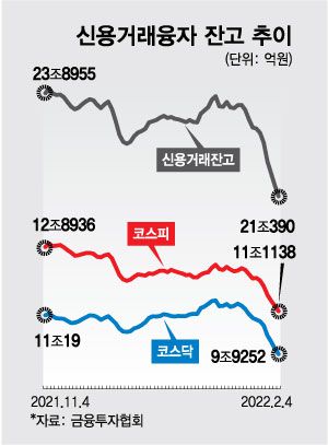 빚을 내 주식에 투자하는 일명 '빚투족' 역시 사라지고 있다. 금융투자협회에 따르면 지난 4일 기준 신용융자잔고는 21조390억원으로 집계됐다. 지난달 18일 23조5692억원을 기록한 이후 10거래일 연속 하락했다. 지난해 9월 중순(25조5000억원)과 비교하면 반년 만에 약 4조원 이상 줄었다.