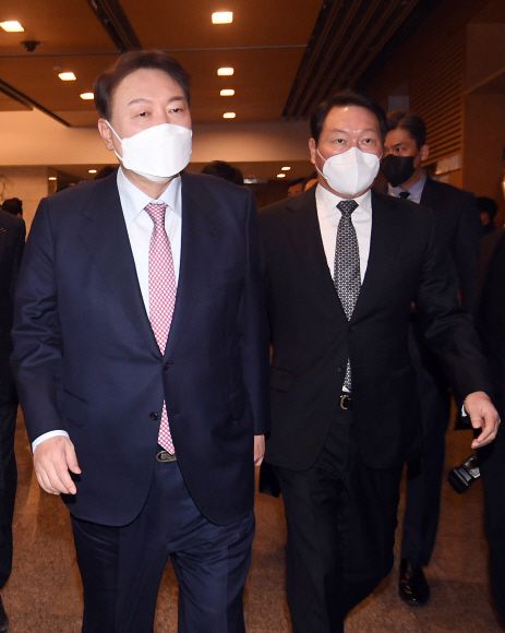 상의 찾아간 尹 - 윤석열(왼쪽) 국민의힘 대선후보와 최태원 대한상공회의소 회장이 7일 서울 중구 대한상공회의소 국제회의장에서 열린 대선후보 초청 특별강연에 참석하기 위해 이동하고 있다.김명국 선임기자 |