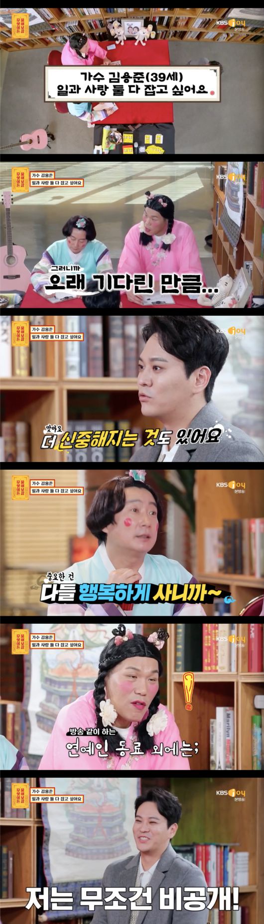 "마지막 연애는 언제냐"는 질문에 김용준은 "4~5년 정도 됐다. 마지막 연애 이후 사람 만나는게 더 어려워지고 두렵기도 하다"고 답했다. 서장훈은 "된통 당했니? 왜 두려워? 돈 뜯겼어?"라며 의문을 표했다. 김용준은 "지금 만나는 여자가 마지막 여자라는 생각이 드니까 더 신중해 지는 것 같다"고 답헀다. 김용준의 고민에 서장훈은 결혼 정보회사를 추천했다.