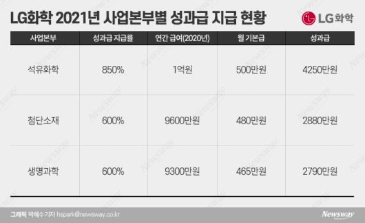 이에 따라 성과급 지급률이 가장 높은 석유화학사업본부 직원은 2020년 남성 직원 평균 연간 급여 1억원, 연간 급여의 20분의 1인 월 기본급 500만원 기준 평균 4250만원의 성과급을 수령한 것으로 추산된다.