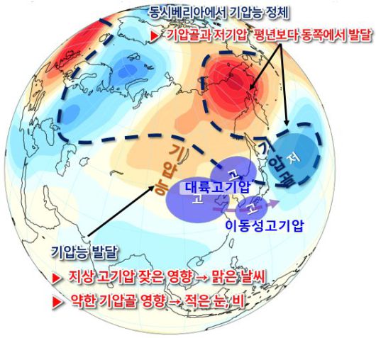 다만 대륙고기압이 국내로 세력을 확장할 때는 찬 공기가 해상을 지나면서 해기차(기온차)에 따른 눈구름대가 자주 만들어졌다. 이에 따라 서쪽 지역, 동해안 등을 중심으로 눈이 종종 내렸다. 하지만 눈이 강하게 내리거나 내륙까지 눈구름대가 깊이 들어오는 경우는 거의 없었다. 눈이 와도 강수량을 늘리는 데 크게 기여하지 못한 것이다.