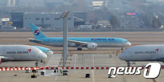 (인천공항=뉴스1) 김명섭 기자 = 공정거래위원회는 오는 9일 전원회의를 열고 대한항공과 아시아나항공의 기업 결합 안건을 논의할 예정이다. 앞서 공정위는 일부 슬롯(시간당 가능한 항공기 이착륙 횟수) 반납과 운수권(정부가 항공사에 배분한 운항 권리) 재배분을 이행하는 조건으로 양사의 기업결합을 승인하는 내용의 심사보고서를 작성해 전원회의에 상정했다. 사진은 8일 인천공항에서 양사 항공기가 함께 있는 모습. 2022.2.8/뉴스1
