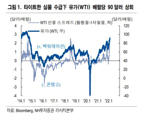 WTI(서부텍사스유)는 이달 3일 배럴당 90달러를 돌파했다. 유가가 90달러를 넘어선 것은 2014년 하반기 이후 처음이다. 전문가들은 유가가 배럴당 100달러를 돌파하는 것은 시간문제이며, 150달러까지 치솟을 수 있다고 전망하고 있다. 원·달러 환율 상승을 고려하면 원화 환산기준 유가는 이미 100달러를 넘어섰다는 분석도 나온다.