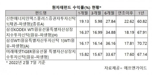 8일 펀드평가사 에프앤가이드에 따르면, 2022년 2월 7일 기준 국내 설정된 원자재펀드(42개)의 연초 이후 기간수익률은 4.89%로 집계됐다.