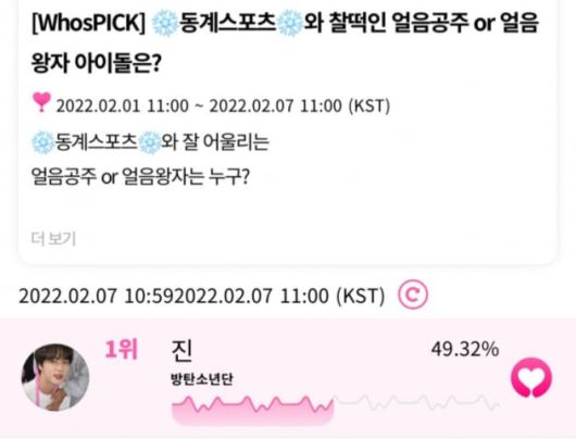 진은 글로벌 케이팝 팬덤 플랫폼 ‘후즈팬(Whosfan)’에서 2월 1일부터 7일까지 진행된 ‘동계 스포츠와 찰떡인 얼음공주 or 얼음왕자 아이돌은?' 설문에서 1위를 차지했다.