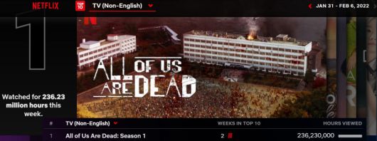 '지금 우리 학교는'은 넷플릭스가 9일 공개한 1월 31일부터 2월 5일까지 일주일간 '글로벌 비영어 시리즈' 톱10 1위에 올랐다. 일주일 누적 시청시간은 총 2억3623만 시간으로 주간 3325만~6048만 시간을 기록한 영어 영화·시리즈, 비영어 영화 1위를 모두 압도했다.