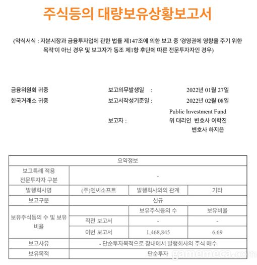 공시에 따르면 지분 매입 목적은 단순투자로, 장내에서 매입했다. 아울러 이번 투자로 PIF는 김택진 대표, 넷마블, 국민연금에 이어 엔씨소프트 4대 주주로 자리했다.