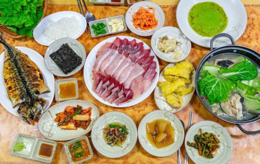 제주도 모슬포항 항구식당의 방어회 상차림. 방어회와 함께 방어전, 방어지리, 방어회무침 등이 딸려 나온다. 방어회는 뱃살, 꼬리살, 사잇살 등 부위별로 골라 먹는 재미가 있다. |