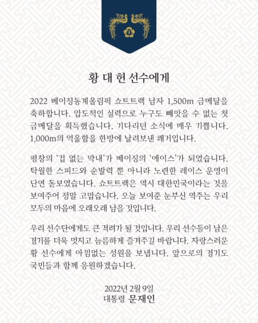 문재인 대통령 트위터 캡처문재인 대통령은 9일 2022 베이징동계올림픽 쇼트트랙 남자 1500m 결승에서 우승해 이번 대회 첫 금메달을 안긴 황대헌(강원도청) 선수에게 "억울함을 한방에 날려보낸 쾌거"라고 축하했다.