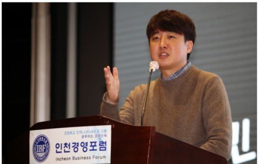 이준석 국민의힘 대표가 8일 오전 인천시 연수구 라마다송도호텔에서 열린 인천경영포럼에서 강연을 하고 있다. 뉴스1 |