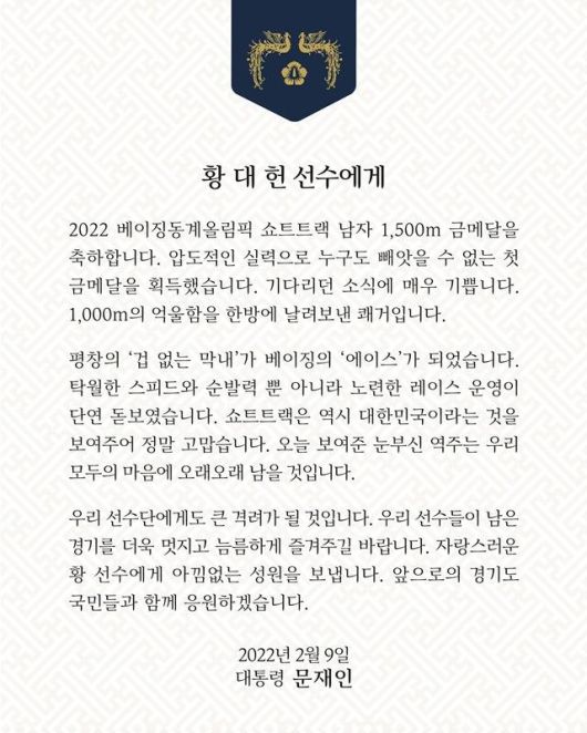 문 대통령은 9일 오후 SNS 축전에서 "황 선수의 2022 베이징 동계올림픽 쇼트트랙 남자 1500m 금메달을 축하한다"라며 "압도적인 실력으로 누구도 빼앗을 수 없는 첫 금메달을 획득했다. 기다리던 소식에 매우 기쁘다. 1000m의 억울함을 한방에 날려보낸 쾌거"라고 밝혔다.