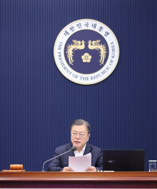 문재인 대통령이 8일 오전 청와대 여민관에서 열린 영상 국무회의에서 발언하고 있다 .(사진=연합뉴스) |