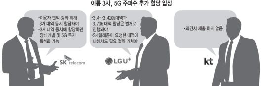 LG유플러스는 기존 자사 인접대역(3.4~3.42㎓) 20㎒ 폭을 먼저 할당하고, SK텔레콤이 요청한 대역은 적절한 절차를 거쳐 추후 할당해야 한다는 입장을 내놨다. 반면에 SK텔레콤은 시간 차이를 두지 말고 3개 대역(3.4~3.42㎓, 3.7~3.72㎓, KT가 원하는 대역)을 동시에 할당하자는 의견을 전달했다.