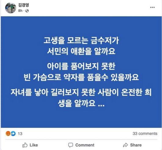 김경영 민주당 서울시의원은 지난 9일 자신의 페이스북에 “고생을 모르는 금수저가 서민의 애환을 알까요. 아이를 품어보지 못한 빈 가슴으로 약자를 품을 수 있을까요”라며 “자녀를 낳아 길러보지 못한 사람이 온전한 희생을 알까요”라는 글을 올렸다.