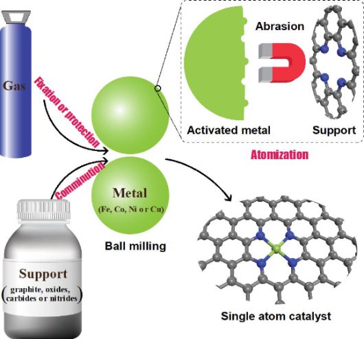 연구팀이 개발한 합성법은 용기에 금속 구슬, 질소 가스, 지지체를 넣고 돌리기만 하면 된다. 금속 구슬이 서로 강하게 충돌하면 표면이 압축과 팽창을 반복해 활성 상태가 된다. 이 때 지지체가 활성화 된 금속을 잡아당김으로써 금속 원자가 쉽게 떨어져 나오는 원리를 쓴다. 같이 넣은 질소 가스도 질소 원자 형태로 지지체 구조 안에 들어가게 된다. 이 질소 덕분에 금속이 단일 원자 상태로 지지체에 안정하게 고정된다.
