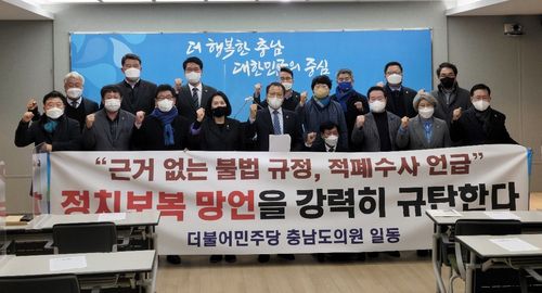 (홍성=연합뉴스) 조성민 기자 = 충남도의회 이계양 의원 등 민주당 소속 의원들은 11일 충남도청 프레스센터에서 기자회견을 열어 "국민의힘 윤석열 대선 후보의 정치보복 망언을 규탄한다"고 밝혔다.