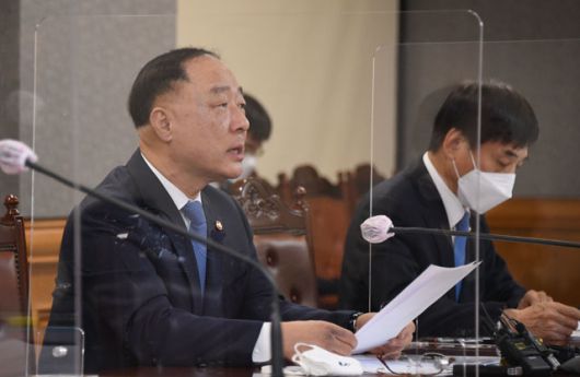 홍남기 부총리 11일 서울 은행회관에서 열린 확대거시경제금융회의 모두발언에서 "최근 경제 상황과 관련해 우리 경제의 회복경로 유지 속에 특히 취약계층에 대한 지원, 금융불균형 완화, 생활물가 안정 방안을 집중적으로 논의하겠다"며 이같이 밝혔다. 이날 회의에는 홍 부총리를 비롯해 이주열 한국은행 총재와 정은보 금융감독원장, 도규상 금융위원회 부위원장 등이 참석했다. 재정·통화·금융당국 수장들이 한자리에 모인 것은 지난해 9월 30일 이후 약 4개월 만이다.
