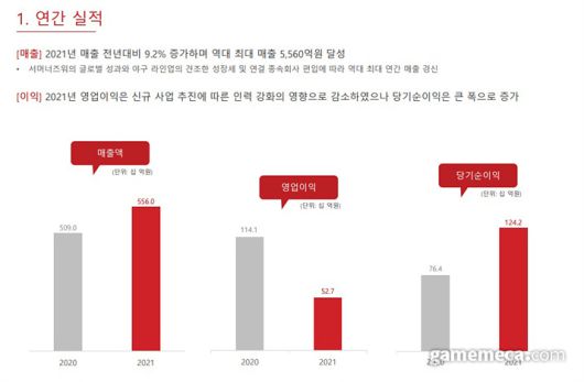 이어, 2021년 4분기 매출과 영업이익, 당기순이익은 각각 1,734억 원, 112억 원, 241억 원으로, 매출은 전년대비 28.5% 상승했고 당기순이익은 흑자전환에 성공했다. 반면 영업이익은 메타버스 포함 신규사업 추진 및 기존사업 강화를 위한 인건비 증가의 영향으로 57.2% 감소했다.;