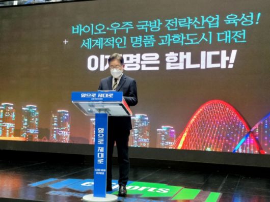 이재명 더불어민주당 대선후보가 12일 대전시에서 대전 지역 공약을 발표하고 있다/사진=이정혁 기자 |