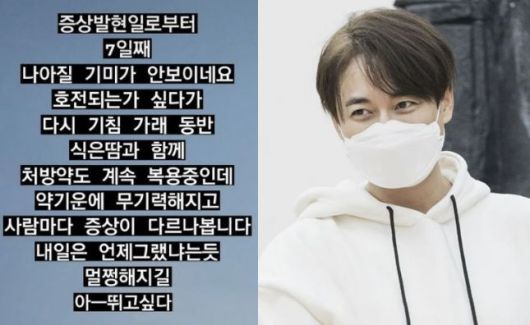 이지훈은 12일 자신의 인스타그램에 "증상 발현일로부터 7일째. 나아질 기미가 안 보이네요"라는 글을 남겼다.