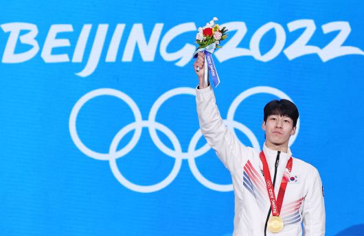2022 베이징 동계올림픽 쇼트트랙 남자 1500m에서 금메달을 획득한 한국 쇼트트랙 대표팀 황대헌이 10일 오후 중국 베이징 메달 플라자에서 열린 메달 수여식에서 단상에 올라 금메달을 목에 건 채 꽃다발을 들어보이고 있다./연합뉴스 |