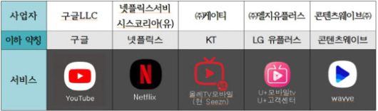 공정위에 따르면 구글과 넷플릭스는 ‘유튜브 프리미엄’과 ‘넷플릭스’ 구독서비스를 판매하면서 ‘계약 체결 이후에는 철회가 불가하며 다음 달 서비스에서 대해서 가능하다’고 안내해왔다. KT는 ‘올레tv모바일’ 이용권을 판매하며 구매 후 6일 이내 콘텐츠에 이상이 있을 때만 환불이 가능하다고 명시했고, LG유플러스와 콘텐츠웨이브도 유사한 환불 정책을 안내했다.