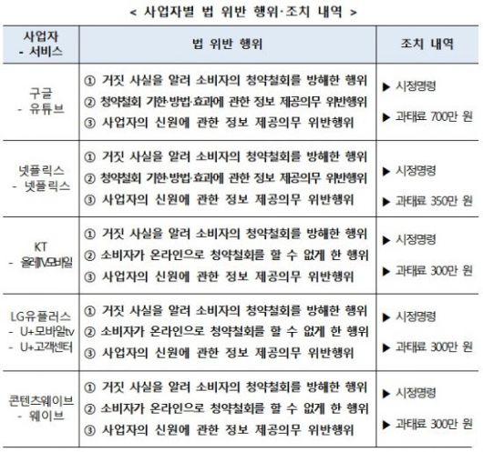구글은 자신이 운영하는 사이버몰 유튜브에서 VOD 콘텐츠와 ‘유튜브 프리미엄’ 구독 서비스를, 넷플릭스는 ‘넷플릭스 구독서비스’ 를 각각 판매하면서 소비자에게 이러한 정보를 제공하지 않았다. 공정위는 소비자들이 청약철회의 기한·방법·효과 등에 관한 정보를 제대로 알기 어려워 법적으로 보장받는 청약철회권을 행사하는 데 어려움을 겪었다고 판단했다.