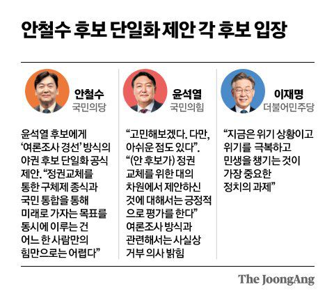 안철수 후보 단일화 제안, 각 후보 입장. 그래픽=신재민 기자 shin.jaemin@joongang.co.kr |