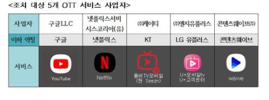 공정위는 이 같은 법 위반 행위에 대해 구글 700만원, 넷플릭스 350만원, KT 300만원, LG유플러스 300만원, 웨이브 300만원 등의 과태료를 부과했다.
