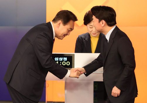 윤석열(왼쪽) 국민의힘 대선 후보와 안철수 국민의당 대선 후보가 11일 오후 서울 중구 매경미디어센터에서 열린 한국기자협회 주최 방송 6개사 공동 주관 2022 대선후보 초청 토론회 시작에 앞서 인사하고 있다. (사진=국회사진기자단) |