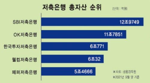 14일 금융감독원 금융통계정보시스템에 따르면 지난해 9월 말 기준 저축은행 자산순위 1위는 SBI저축은행으로 12조9749억원, 2위는 OK저축은행 11조7851억원, 3위는 한국투자저축은행 6조771억원, 4위는 웰컴저축은행 6조32억원, 5위는 페퍼저축은행 5조4666억원이었다.