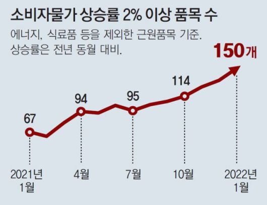 최근 물가 상승 압력은 전방위적으로 확산하고 있다. 한은에 따르면 농수산물, 석유류 등을 제외한 품목 중 전년 동월 대비 2% 이상 오른 품목 수가 지난해 1월 67개에서 올해 1월 150개로 늘었다. 특히 외식 품목과 가구, 자동차 등 내구재의 가격 상승세가 크다.