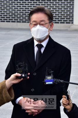 더불어민주당 이재명 대선후보가 14일 오전 서울 동작구 국립서울현충원을 참배하고 취재진의 질문을 받고 있다.2022. 2. 14 김명국 선임기자 |
