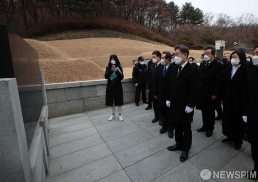 [서울=뉴스핌] 이형석 기자 = 이재명 대선후보가 14일 서울 동작동 서울현충원에서 박정희 전 대통령 묘소 참배를 한 뒤 시비를 바라보고 있다. 2022.02.14 leehs@newspim.com 저작권자(c) 글로벌리더의 지름길 종합뉴스통신사 뉴스핌(Newspim), 무단 전재-재배포 금지