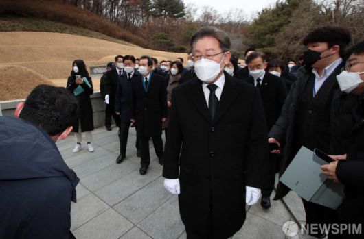 [서울=뉴스핌] 이형석 기자 = 이재명 대선후보가 14일 서울 동작동 서울현충원에서 박정희 전 대통령 묘소 참배를 마치고 나서고 있다. 2022.02.14 leehs@newspim.com
