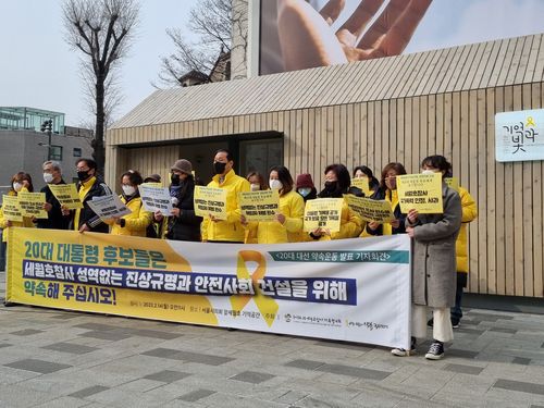 (서울=연합뉴스) 김치연 기자 = 세월호 참사 유족들이 대선 후보와 여야 정당에 세월호 참사 진상 규명과 책임자 처벌 등을 촉구하며 정책 과제를 발표했다.