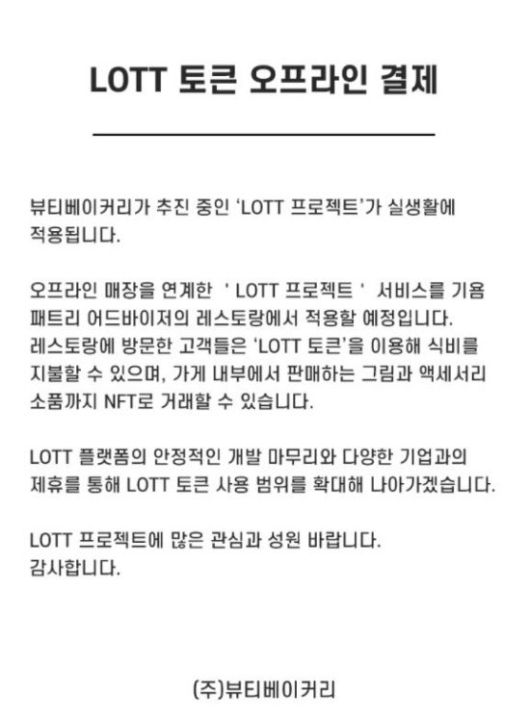 'LOTT 프로젝트'는 케이뷰티(K-BEAUTY), 케이팝(K-POP) 및 다양한 분야에 NFT 기술을 접목시킨 블록체인 플랫폼 신사업으로 'LOTT 토큰'을 결제수단으로 활용한다. ‘LOTT 토큰’은 LOTT 플랫폼뿐만 아니라 LOTT 프로젝트와 연계된 메타버스 생태계에서 결제 수단으로 사용되고 향후 제휴를 통한 외부 오프라인 매장 등에서 사용이 가능하게 될 예정이다.