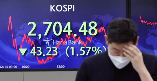 14일 유가증권시장에서 코스피는 전 거래일보다 43.23포인트(1.57%) 내린 2704.48에 거래를 마쳤다. 오전 한때 2.16% 하락한 2688.24까지 밀리기도 했다. 코스닥은 낙폭이 더 컸다. 전 거래일보다 24.63포인트(2.81%) 내린 852.79에 마감했다.