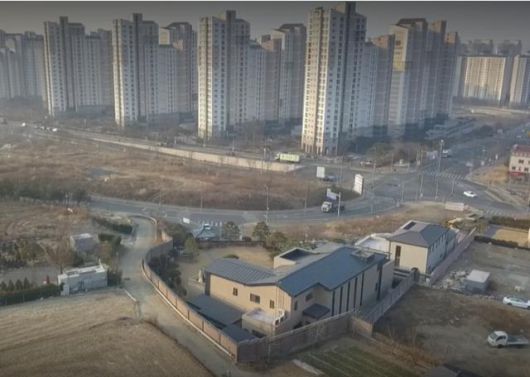 박근혜 전 대통령의 사저로 예정된 전원주택 앞쪽으로 대규모 아파트단지가 들어서 있어 파파라치에 취약하다는 지적이 일고 있다. 전준호 기자 |